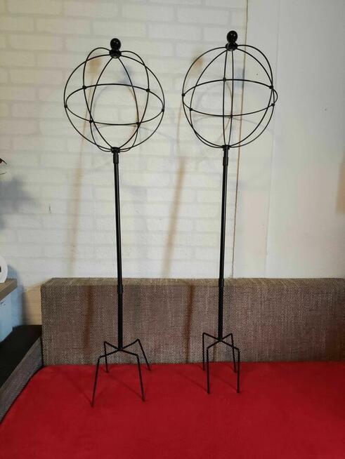 Metalowe konstrukcje ogrodowe w kształcie kul, idealne do podparcia i prowadzenia pnących roślin, takich jak róże. ...